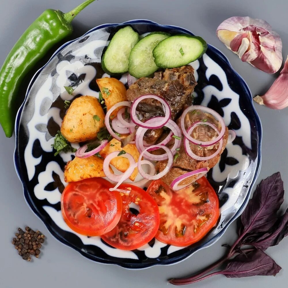 баранина, картофель, лук красный, помидор, огурец, специи, зелень