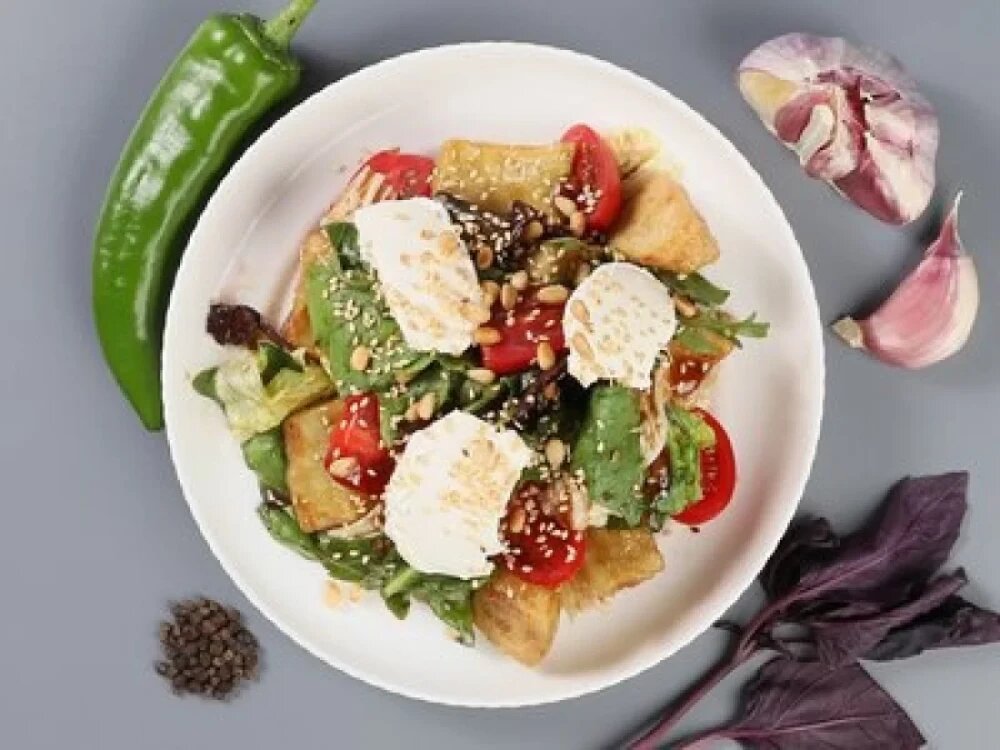 баклажан, помидор черри, сыр креметта, кунжут, кедровый орех, соус, специи