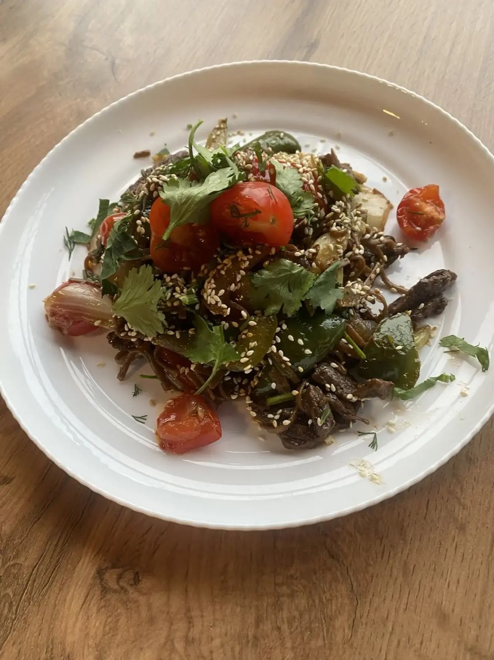 Лапша гречневая, болгарский перец, капуста пекинская, томат чери, кинза, кунжут, говядина.