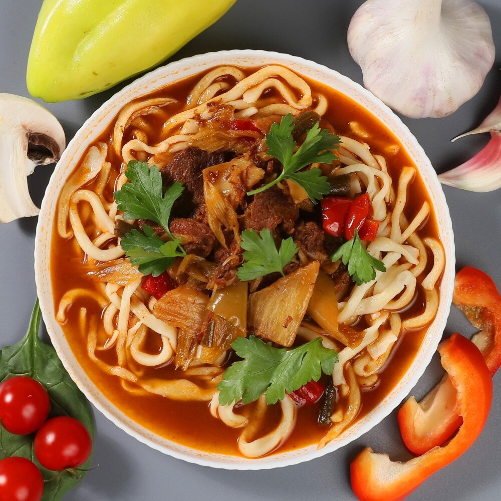 лапша домашняя, говядина, сельдерей, томатная паста, перец болгарский, лук, чеснок, морковь, специи